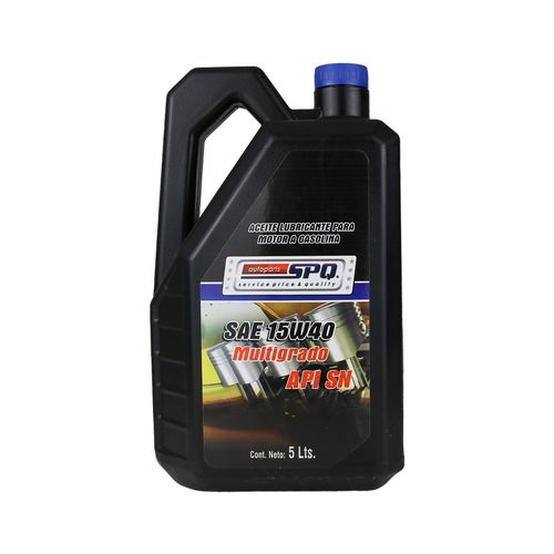 ESPECIFICACIONES >> SAE 15W40, ACEITE MULTIGRADO PARA MOTOR A GASOLINA API SN, CONTENIDO >> (1 PIEZA) GARRAFA CON 5 LTS. > ESTÁ DISEÑADO PARA SER UTILIZADO EN VEHÍCULOS ÚLTIMO MODELO Y AÑOS ANTERIOS PARA LOS QUE ESPECIFICAN UN ACEITE PARA MOTOR API SN.