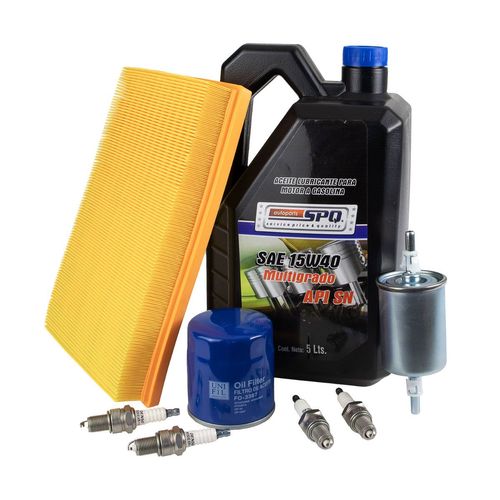 INCLUYE FILTRO DE ACEITE, FILTRO DE GASOLINA, FILTRO DE AIRE, 4 BUJÍAS ESTÁNDAR. 1 GARRAFA DE 5 LITROS, ACEITE MÚLTIGRADO SAE 15W40 API SN, MOTOR A GASOLINA.